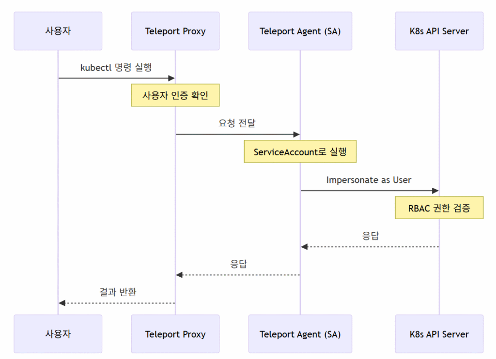Teleport Agent는 ServiceAccount로 실행되지만, 실제 사용자 권한으로 “impersonate”하여 요청을 전달한다. 이 때문에 Agent SA에는 impersonate 권한이 필수다.