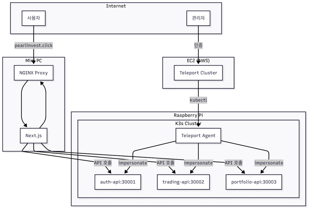 이 프로젝트에서는 pearl-invest라는 가상의 MSA기반 핀테크 앱을 기반으로 Teleport를 도입해 제로트러스트 원칙을 준수하고 RBAC를 구현할 수 있도록 했다.